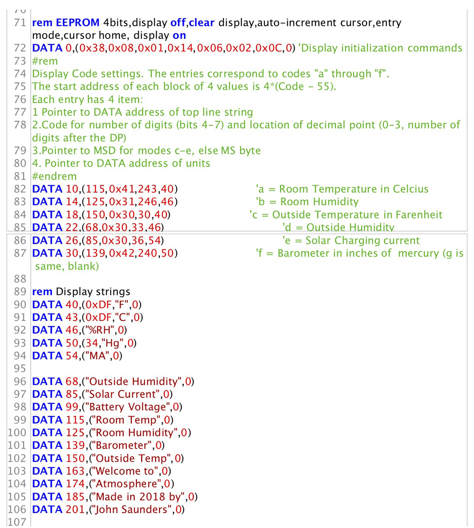 The sections are: 1. The display initialization commands. 2. A table which defines EEPROM and memory addresses for converting and displaying. 3. The units designations which follow the displayed valuues. 4. The Mode messages for the top line of the display.. |