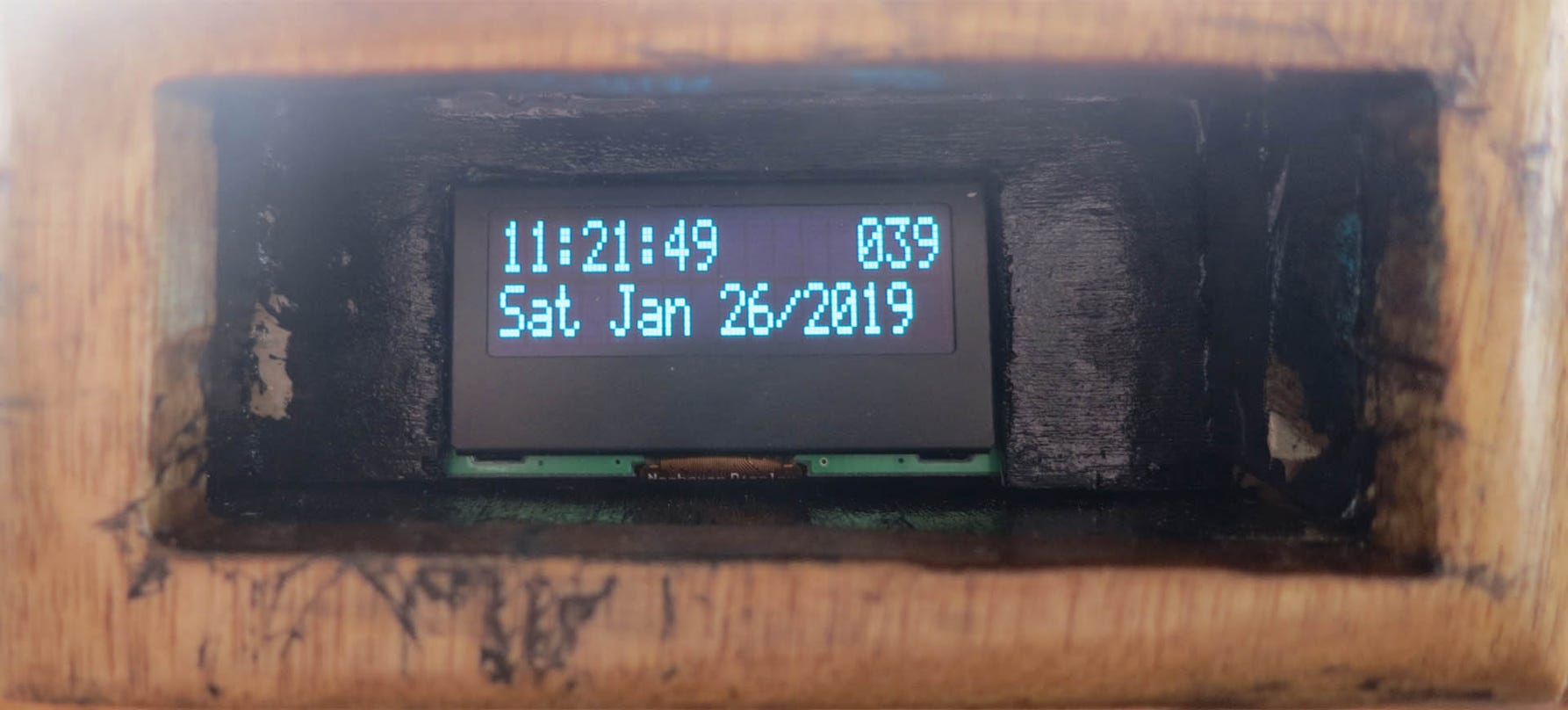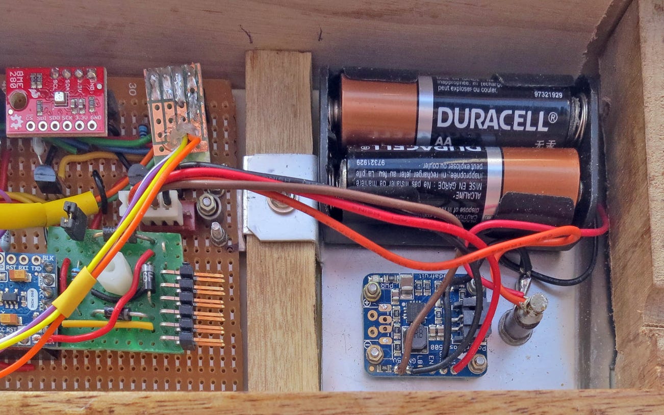 This assembly is mounted upside-down. All sub-assemblies plug into the mainboard.<br>The mainboard is secured by the push-buttons and a screw into a block glued to the box.<br>The OLED display on the left is mounted into slots in the box. <br>The blue board on the right is a USB to RS-232 adapter. It is not included when the project is in use. <br>The green board is a 5V to 3.3V level shifter. It is fastened to the Arduino. The USB adapter is 5V but everything else is 3.3V.<br>The 4-pin header connects to a pigtail from the power assembly.