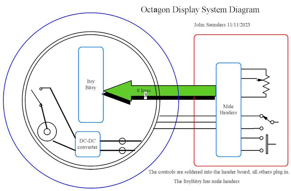 The control assembly includes a board with sets of 5-plated-through connected holes, plus 2 busses. The controls are soldered into it and are then connected to male headers. This enables all connections to the processor to use pre-made jumper wires. The neo-pixel string also plugs into this board with the pigtail which came with it.