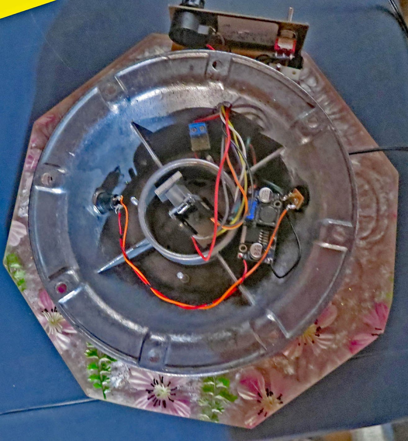 The octagon is supported by a metal casting which was a base for a pole. It has enough space inside for the electronics, but the controls had to be outside it for accessibility.
