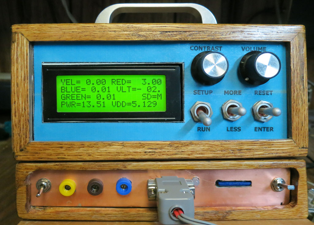 This is a revised entry since the System Unit of this project has previously been operating continuously since January 2006 as the precursor of the Weather System. It contains: 1. The Controller which provides Display, Control, Analog-to-Digital conversion and some of the signal processing. Initially it used a StampIISx, which was changed in 2009 to a Picaxe 40X2 in order to get increased ADC precision. This involved a new digital board, and the box wiring was cleaned up, but the analog board was unchanged. 2. For this project a new unit, the Battery Box, was constructed, which mounts under the System Unit, to which it is connected by a 15-conductor cable. This Battery Box includes a recording facility on a Secure Digital module, in addition to the rechargeable battery which can run the project for a day. Also provided are two additional analog inputs and a serial digital input. 3. The Probe is an accessory which plugs into the rear of the System Unit. It provides a bipolar voltage input and a bipolar, differential, current input. Separately, there are connections for a SPDT relay and a MOSET power switch. |
