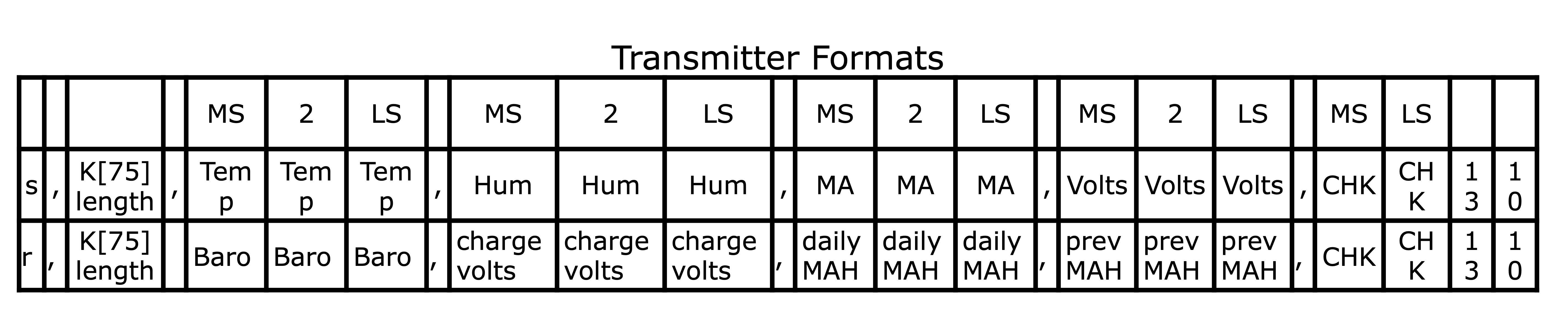 2) A gap of 10 milliseconds. 3)A gating sequence of 7 ASCII characters. All items are sent at 2400 baud. The first item of each message is an ASCII character which identifies which message. Both messages have 4 fields providing analog values in 3 ASCII digits. Item 3 indicates the number of items which contribute to the checksum. The ASCII letter K is decimal 75. The number of characters is 15 (75-60). The checksum consists of 2 hexadecimal digits which follow the last analog value<