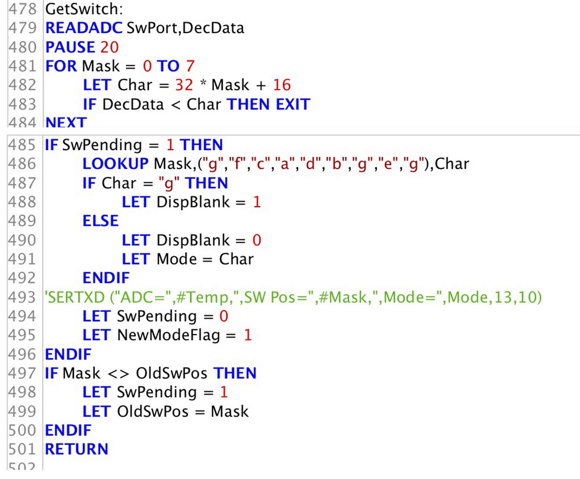I do have, and have used, grey-coded rotary switches, but they require multiple wires and Picaxe pins, which were not available. This is pretty easy to wire, using a resistor pack, and the decoding is robust. The switch is make-before-break but nevertheless I used a two pass procedure. On the first pass, when a change is detected, the "SWPending" flag is raised, and the Mode not changed. On a subsequent pass Mode is updated. There is an arbitary relationship between the switch position and Mode partly because the switch is wired haphazardly, for convenience. The switch has more positions than there are Modes. The other positions raise a "DispBlank" flag, which is cancelled by any subsequent Mode change, local or remote. A successful Mode change raises the "NewModeFlag" which causes refreshing and updating of the display |