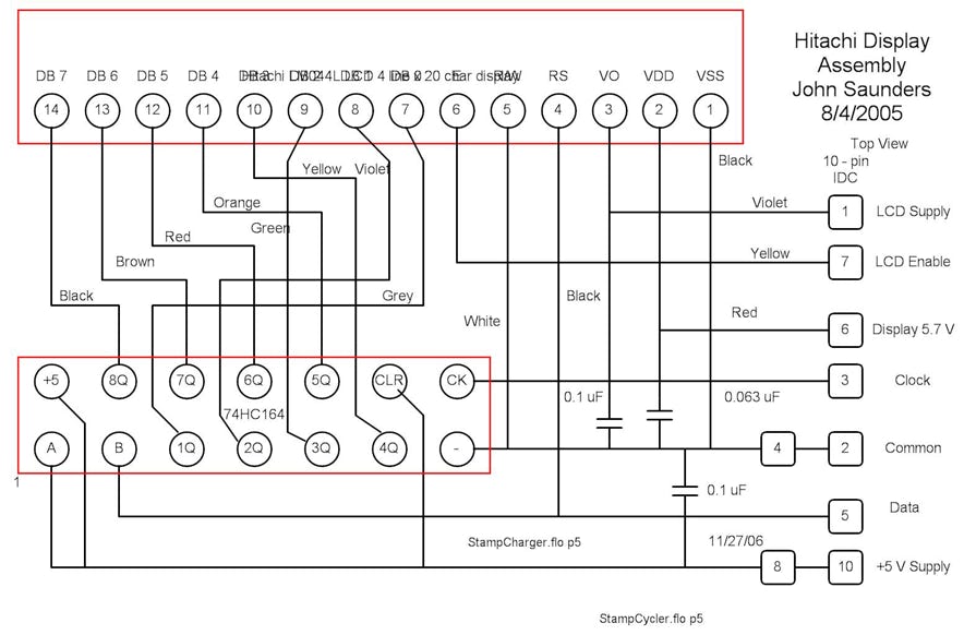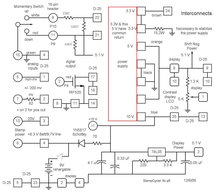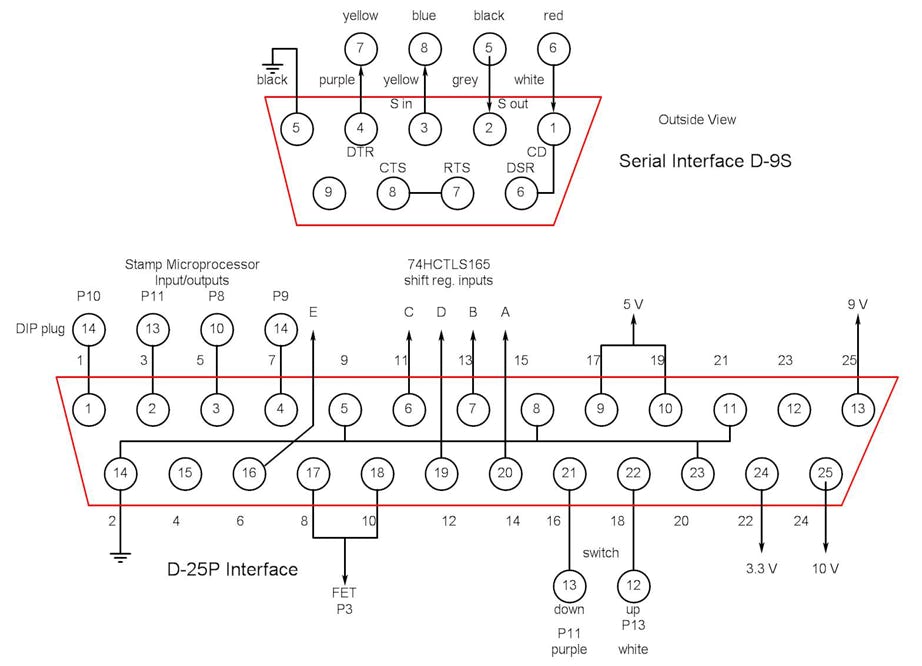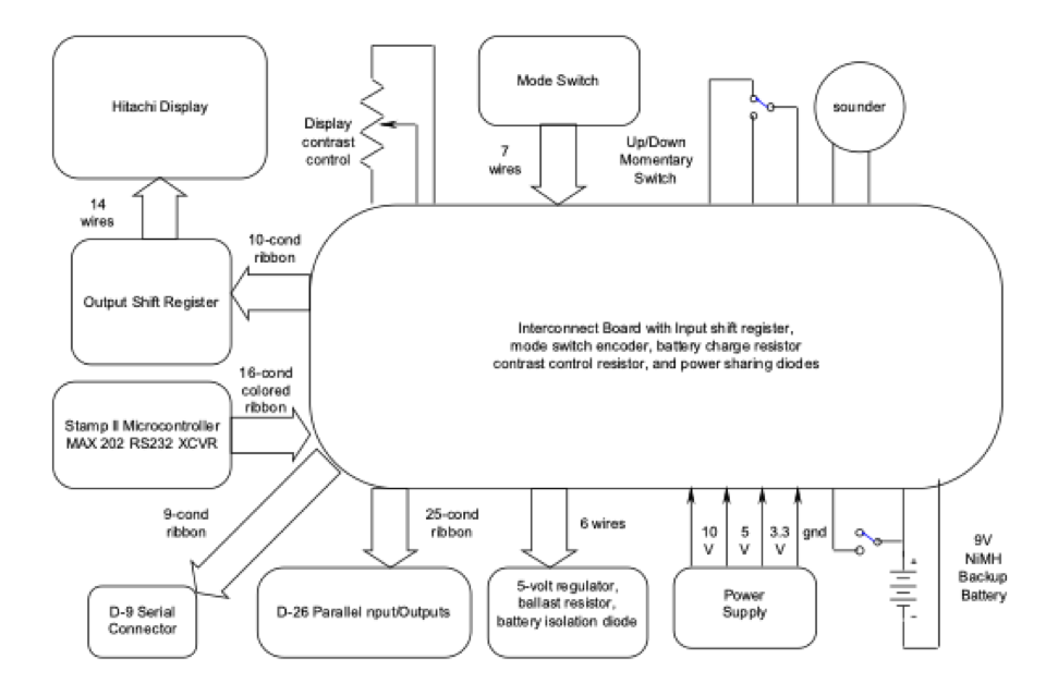 The display, mode switch, display contrast control and the up-down switch are mounted on the front panel. The display has a parallel interface which is converted from serial by a shift register on a separate board mounted on the right side. This connects to the display with 14 wires and has a 10-pin header. The other front panel components are hard-wired, The rear contains the battery on-off switch, the D-9 S serial I/O and the D-25 P parallel I/O connectors, all of which are hard-wired. The power supply is on the bottom left and there is a small assembly at the back with some components too large for the interconnect board.