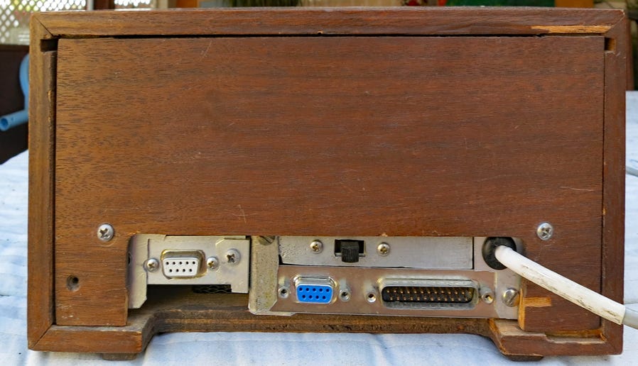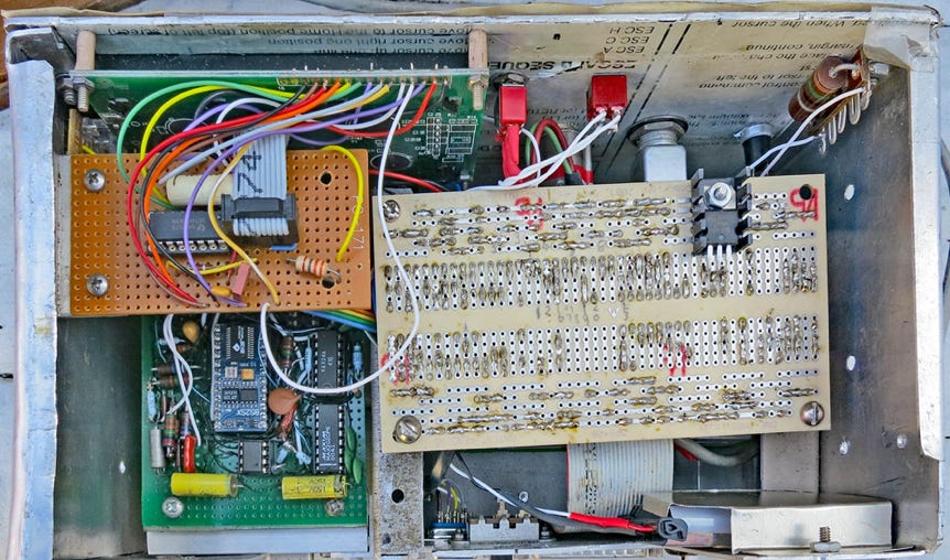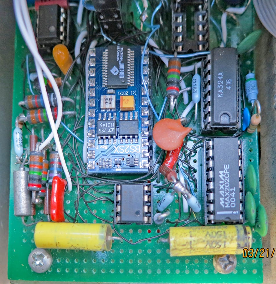 This is the hardware in the wooden “shadow” box with the 4-line x 40 character LCD display. It is used to develop programs for the included Parallax Stamp II microcontroller. In addition to the display it has a 6-position “Mode” switch, an up-down momentary switch, a PC-compatible serial port, and a D-25 P connector with five input and five parallel outputs. It is powered by an internal switching power supply with a 9V rechargeable backup battery. It is programmed in its special Basic via the Parallax editor on a PC connected to the microcontroller via a serial link to its programming port. Accurate timekeeping is provided by a digital watch circuit with a crystal-controlled 32 Hz output.