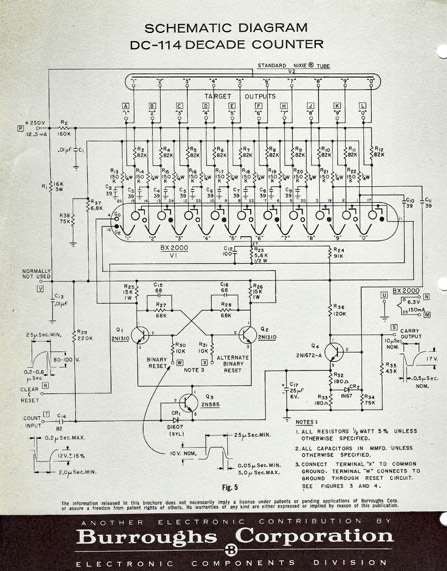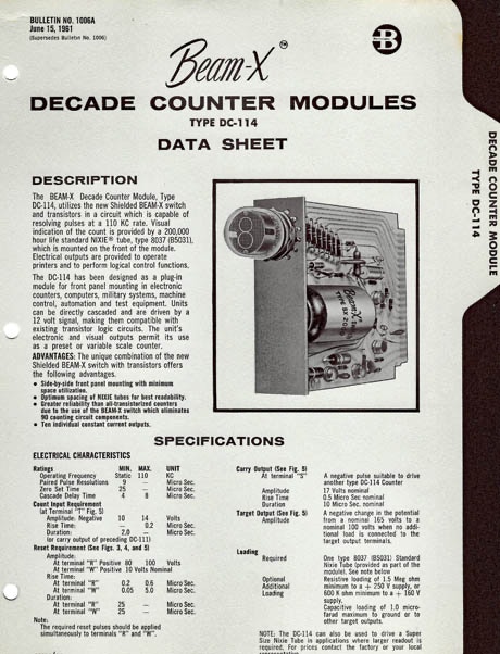 It has 6 decade counters using now-antique Burroughs Beam-X tubes which use magnetic rods in a vacuum tube to count to 10. Since this only worked to 110 KHz, I added a divide-by-ten using a IC when this became available. The Beam-X tubes directly drive NIXIE tubes for display.