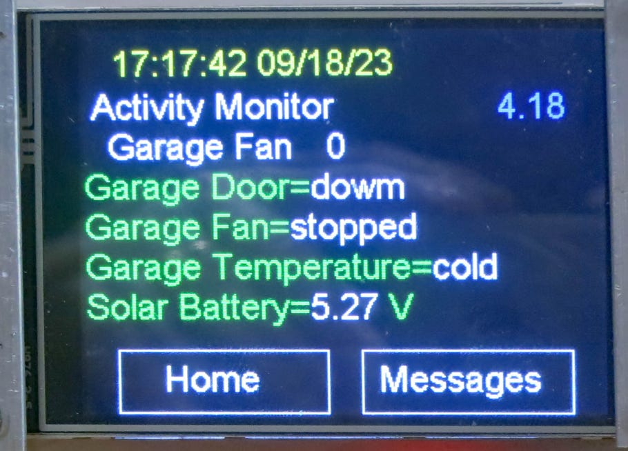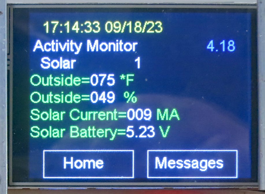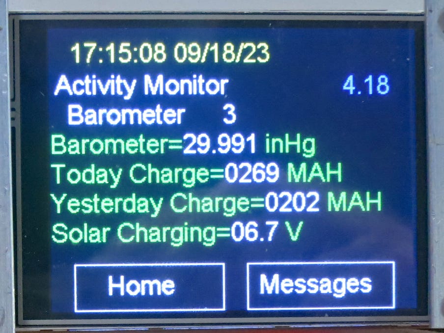 The Activity display is selected from the Main page. Its navigation buttons go back there or to the Messages page. It also always shows its header the time, date and battery voltage. The battery voltage display changes color with range: Blue, Green. Red. On red, turn off or plug in a charger! Each also shows the minutes since the previous receipt.