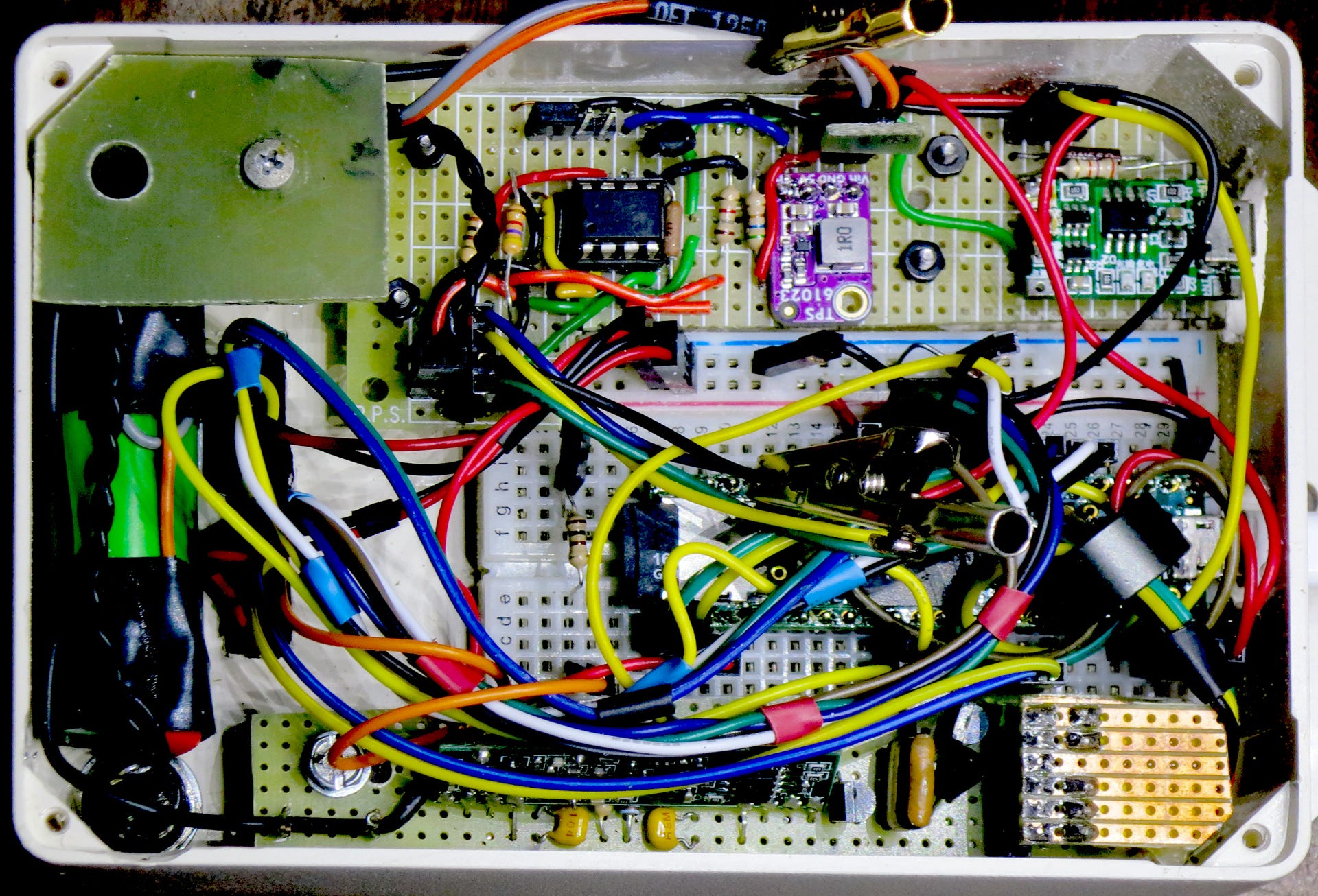 The Teensy is plugged into a breadboard. The Picaxe, DC-DC converter, the two LEDs and the charger are on one circuit board, and the receiver on the other. The 18650-size battery has a connector on a pigtail. It is restrained by barriers and an elastic button on the closure.