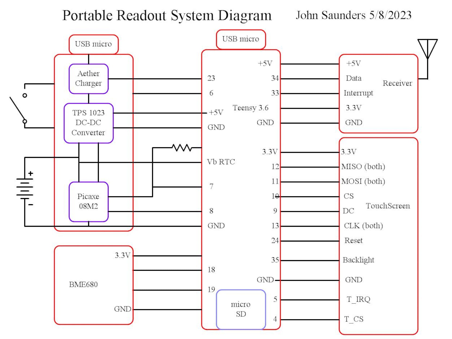 All interconnections are made with jumper cables. Visible are the pushbutton and two LEDs. A blue one flashes on receipt of a message. The other has red and green LEDs. The red is connected to the pushbutton, the green to the 5V output of the DC-DC converter. An exception is the RTC battery connections which goes directly from the Teensy to a connection next to the battery connector on the Power sub-assembly.