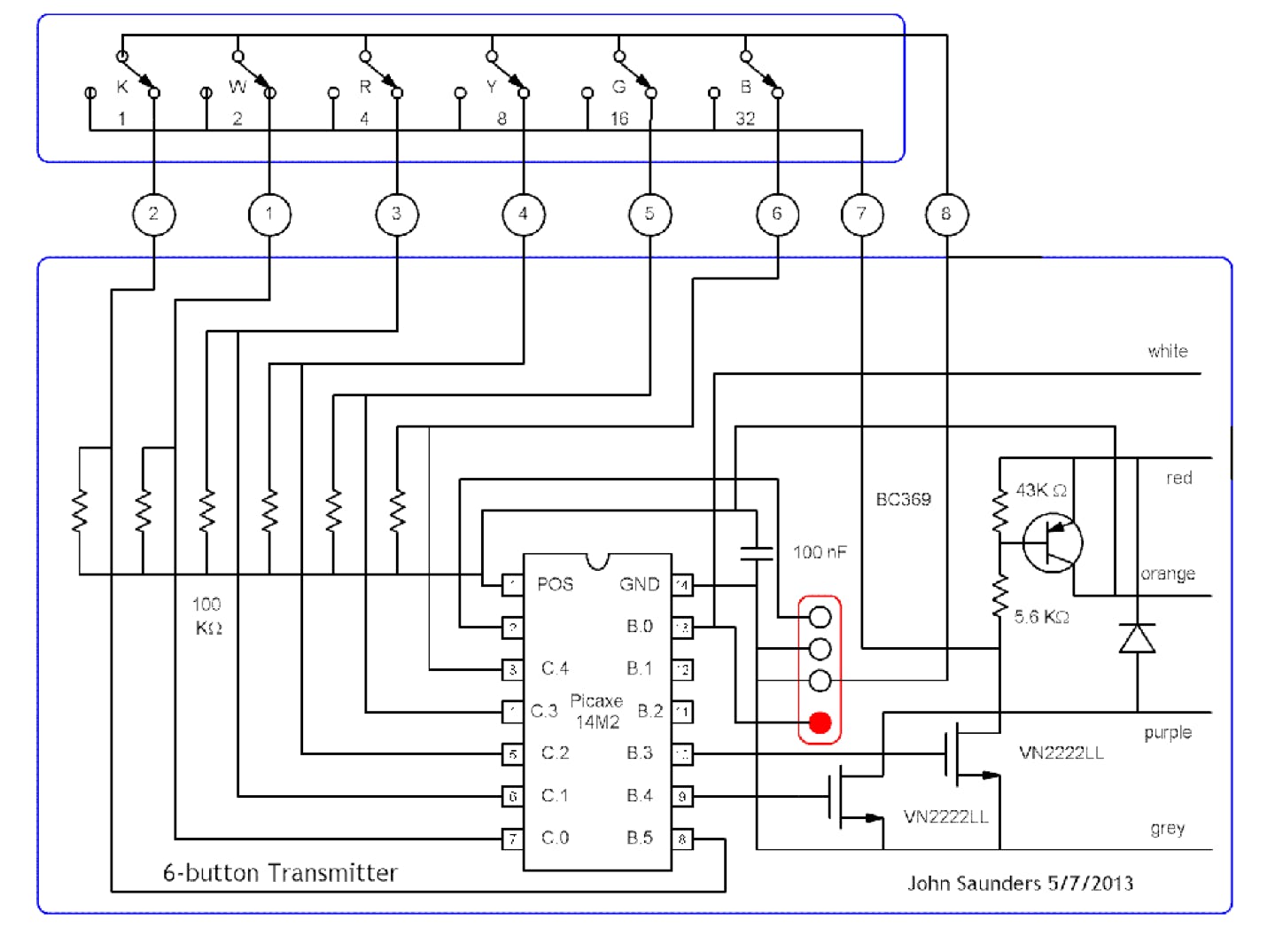 The circuit uses a Picaxe 14M2 which has 4 functions: