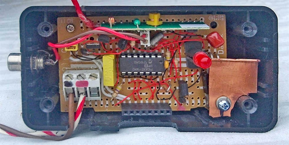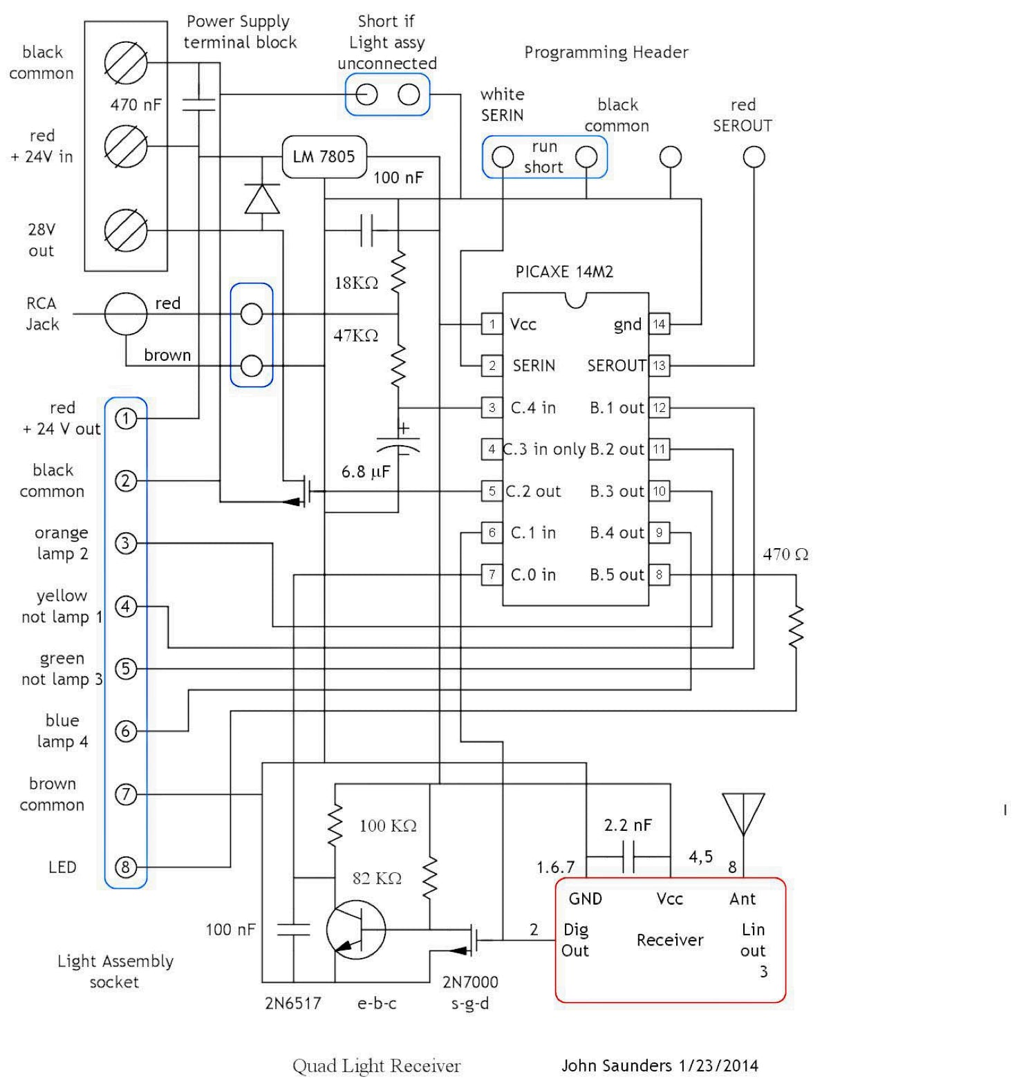 LThe receiver is similar to the other ones in the net, It uses a Picaxe 14M2 which has sufficient ports for the 5 controlled outlets.