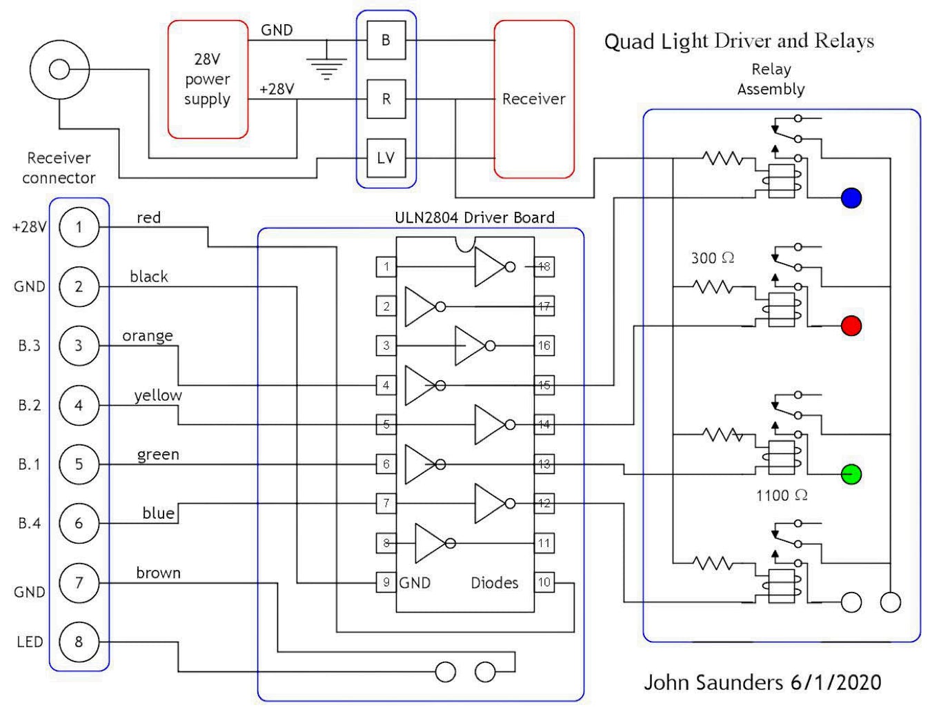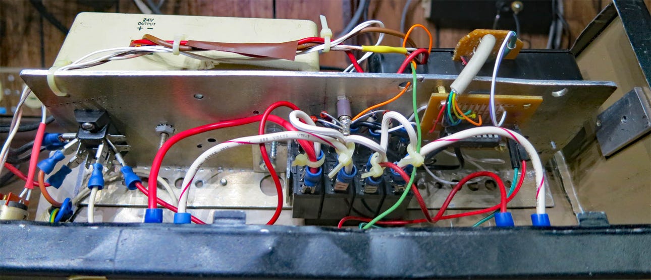 The high voltage section includes two split duplex outlets, 4 relays and the relay driver. There is also a coax power jack for a 5th. output. This is at 28V DC.