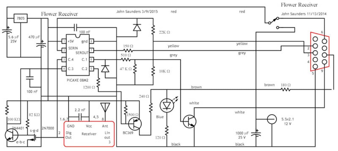 This is called Flower because my wife, who is an artist, made it pretty. It is kept handy at my workbench to test the output of transmitters in projects being developed. It therefore has flexible power options and a visible activity light, It also has digital outputs.