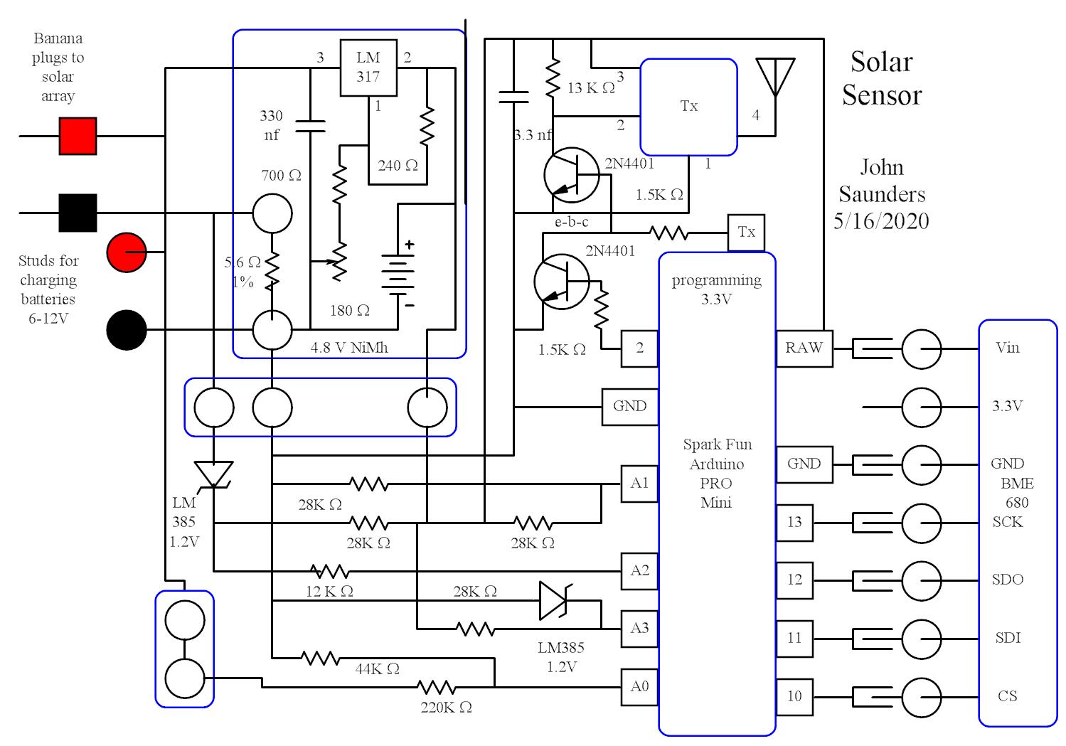 Here are the circuit diagrams. The battery voltage of 4.8V is reduced to regulated 3.3V by sepatate regulators in the sensor and the procesor. The transmitter uses the battery voltage directly.