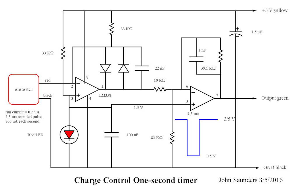 This uses a watch I bought long ago on a trip to Sandpoint. I never used it as it cannot be worn on my wrist and the compass is poor. The watch and its associated board is recycled from my Stepping Motor Clock; a project I consider unsatisfactory because the gears have too much friction. The watch was modified only to remove the battery and solder wires to its contacts. It still keeps time. The watch uses 1.5 V regulated by a red LED and the amplifier provides a virtual low-impedance battery substitute. Every second when the watch moves its second hand it draws a pulse of additional current to rotate its motor. This is amplified to produce a voltage pulse to interrupt the processor. A complication is that while the sheet metal is grounded by the display screws, the adjuster for the watch is connected to its positive battery terminal. When the wheel was pushed in, it contacted the watch case, causing a short circuit. I put an insulating piece of sheet plastic between the watch case and its adjustor, and also insulated the watch case from the sheet metal. Its three wires plug into a header on the Main Board. |