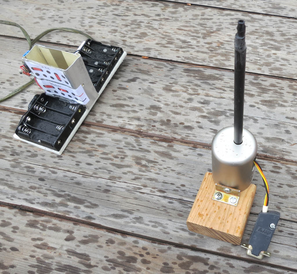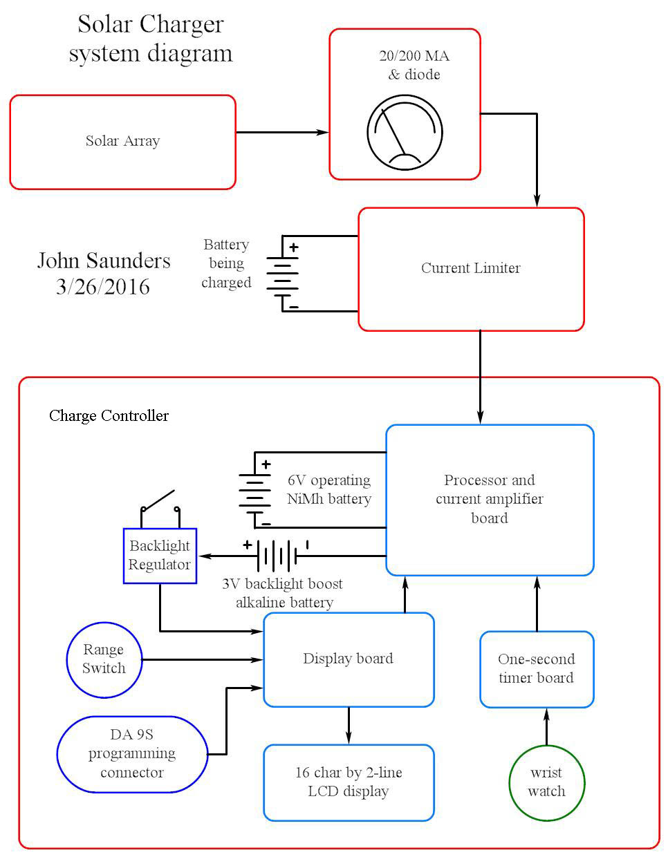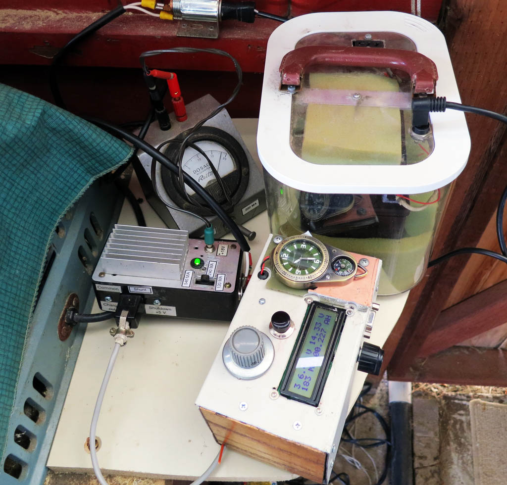 I bought this solar panel cheaply probably because it has a special connector. However it is well sealed, adjustable in elevation, and has a long cable of good quality. It produces 200 MA into a car battery in full sun, and about 1 ampere-hour a day. I have permanently connected it to an old meter box containing a current meter switchable between 20 and 200 MA FSD, and an isolating diode. Note that the meter is labelled "Dosage": it is from an Electro-Convulsive Therapy machine which was discarded in the 1960's! This combination may be used by itself, usually with a lead-acid battery, or with the Current Limiter, which is the smaller box on the left in the photograph. The circuit board for the Current Limiter was originally packaged with a large re-cycled power supply for a different dedicated battery charger. This worked, but I considered it ugly, and re-packaged it in its current form. But later I put it aside as being overkill for that application and replaced it with resistors and a relay. It was modifiied slightly for the Solar Charger to connect the battery to be charged via binding posts, and to insert a shunt resistor so that the Charge Controller can measure the charging current. It can be used with or without the Charge Controller. The Charge Controller is an all-new unit whose purpose is to cut off charging when a selectable number of ampere-hours have gone into the battery. The photo at the bottom is of a battery holder and a 434 MHz transmitter which connects to the DA9S socket pins 2,5 and 6, which has +5V power for it The components of the System Diagram below are described beginning in the next page for the Current Limiter. | |