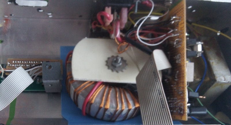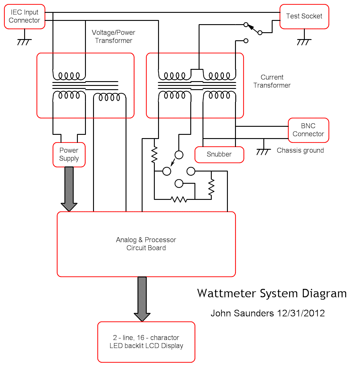 The voltage transformer contains one secondary winding for power and a separate one for the voltage waveform. The current transformer is a large (24 oz) toroid intended as a bench isolation transformer. The original primary winding of 1000 turns is used for measurements, the other is used for monitoring. Two primaries were added of heavy-gage wire, one of 4 and the other of 36 turns. A switch selects decade multiplication.