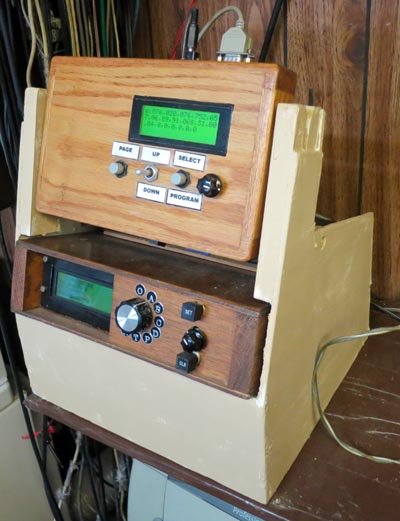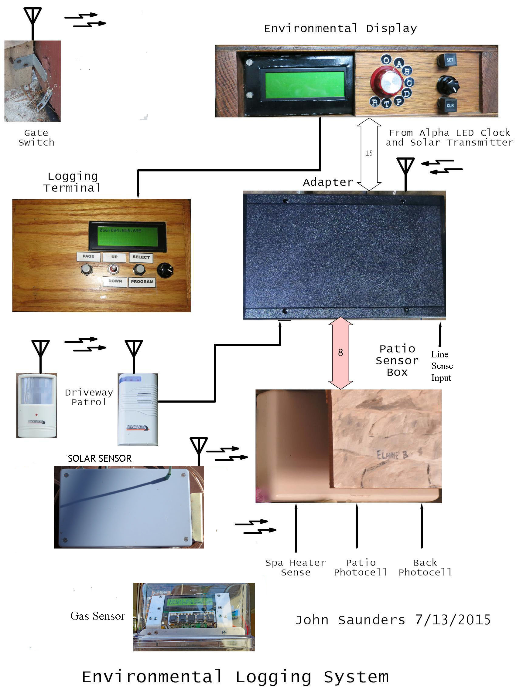By 2015 the Solar Transmitter was in use with its output received by the Flower Receiver and logged by the Logging Terminal. Since this resulted in two recording modules, modifications to the long-time Environmental Logger were evaluated to add a RF receiver, but this was impractical. Instead a controller was made out of a 2008 data acquisition project unit which was not in use. In 2012 modifications were started but abandoned. It was thought that the 2012 controller would be easily modified. It was, but not that easily. Of the other units in this system only the Adapter is new, and that uses the existing Driveway patrol interface. None of the other units needed hardware modifications. The system is powered by 12 VDC from a commercial Uninterruptable Power Supply. The Controller, the Logging Terminal and the Adapter are CO-located in a wooden "Cradle" in the garage, which is connected to the Patio Sensor Box outside by a cable. The RF messages are also logged by the OLED Logger, which also has its own analog inputs.